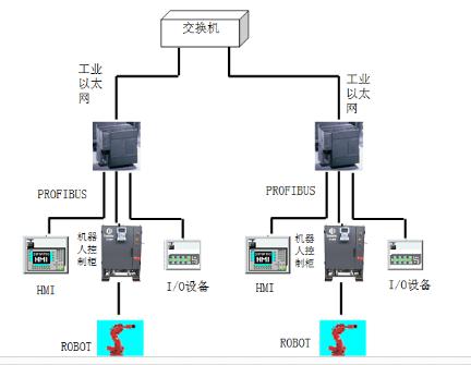 两条自动化生产线和5条空中输送线由CPU 416-2DP、CPU 315-2DP的13台西门子PLC控制。PLC可向系统提供分析设备运行状态和发生故障点的信息。每条生产采用1台西门子人机界面PC870进行控制,通过自身的MPI接口与PLC连接,内部安装西门子组态监控软件WINCC。整条生产线采用两种总线模式,PLC与机器人间及PLC与I/O设备之间采用PROFIBUS现场总线进行通讯。PLC与PLC间的通讯全部采用西门子生产的CP443—1交换机进行通讯和数据交换。