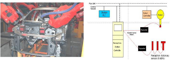 Perceptron测量系统通过机器人上的激光传感器采集车身实际尺寸,j9九游会官网入口系统通过中转器把数据传输到数据控制站进行分析和标准数据进行对照比较,尺寸出现超出工艺范围,数据站立即发给PLC控制的生产线故障和报警信号,停止生产线,防止不合格车身流到下道工序。