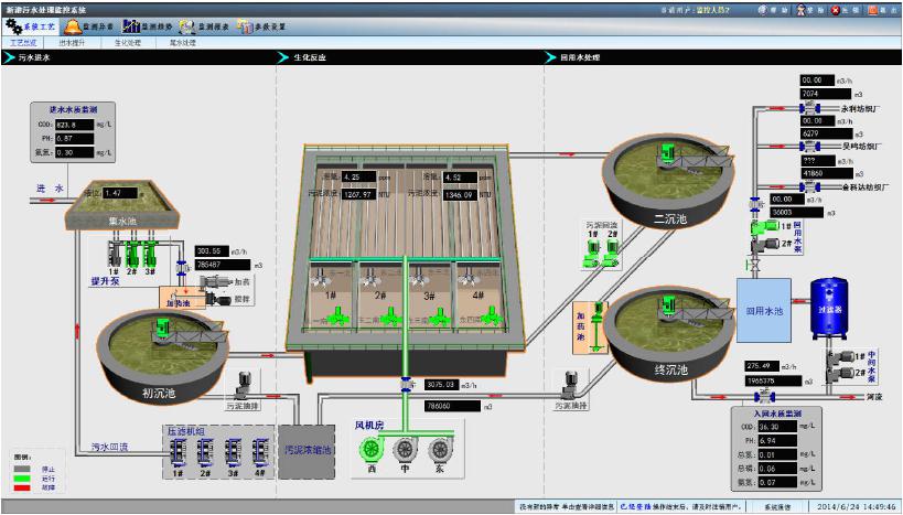 2. 可集中控制整个污水处理工艺自动过程,比如:加药、曝气、压滤等处理环节,同时能够自动对整个处理过程和处理情况进行监测和控制;